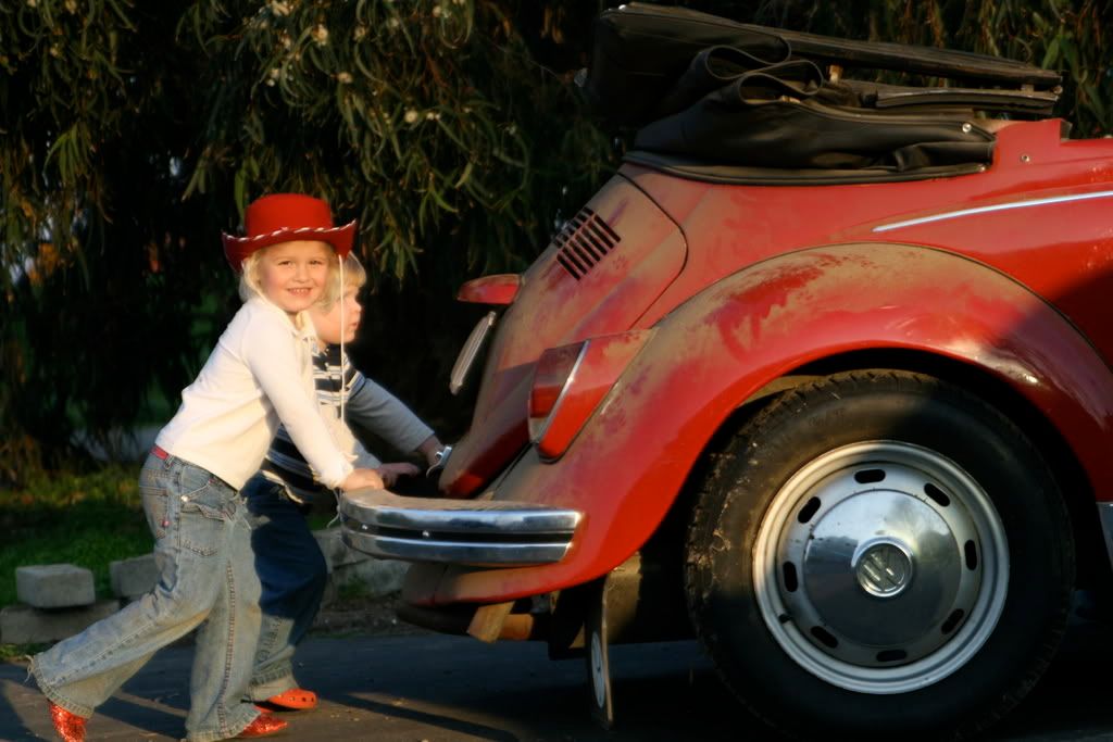 to start with we needed a prop - so we rolled the old red bug out of the garage. sailor thought red sparkly shoes would be a good idea too. and she shared some old red crocs with jack.