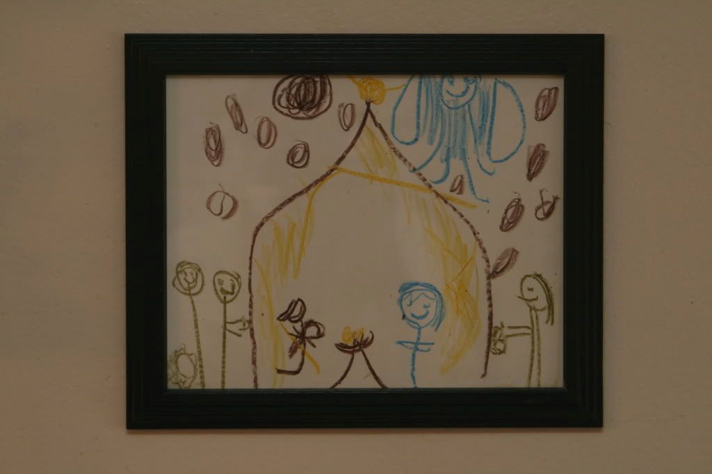 manger scenes like the one above were most popular. so were angels, snowmen & stick person drawings of the family it was going to. they were all original. the cousins she's never met that sent a picture with santa in it she drew santa, the reindeer & his sled. the last thing she did with aunt robin was make gingerbread houses so her envelope had them making gingerbread houses on the front. she went the the beach last with amy k - so her's got a big wave & sand. she said it was 'tough' to draw mommy's holding babies so sometimes the daddy's were drawn holding the babies.