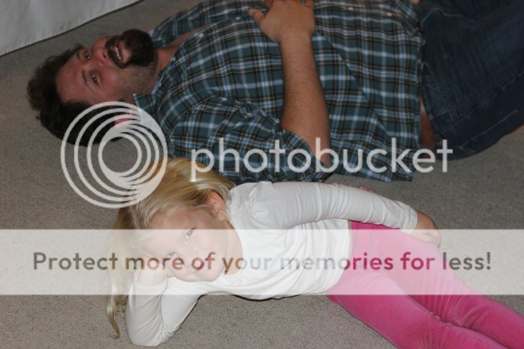 she takes sit-ups with dad pretty seriously ... except when she pauses to pose for a picture |